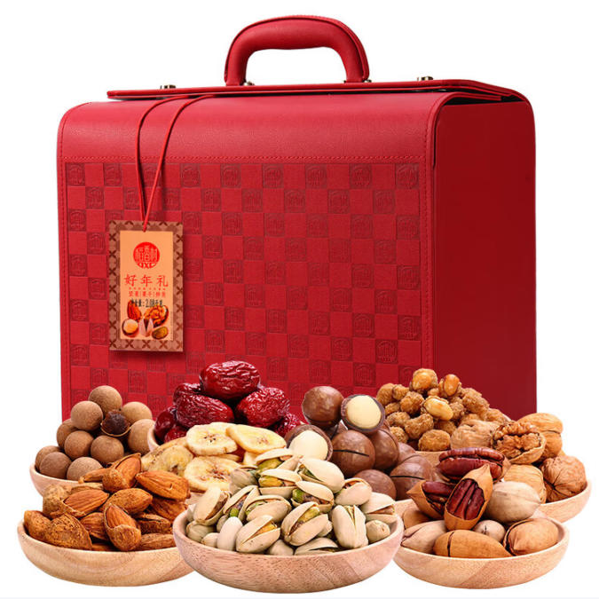 美国开心果(盐焗)100g*1 美国巴旦木100g*1 南非碧根果100g*1 南非夏威夷果(奶油味)150g*1 玫瑰红葡萄干220g*1 薄皮核桃480g*1 菲律宾香蕉干180g*1 多味花生150g*1 新疆红枣300g*1 泰国桂圆干300g*1
